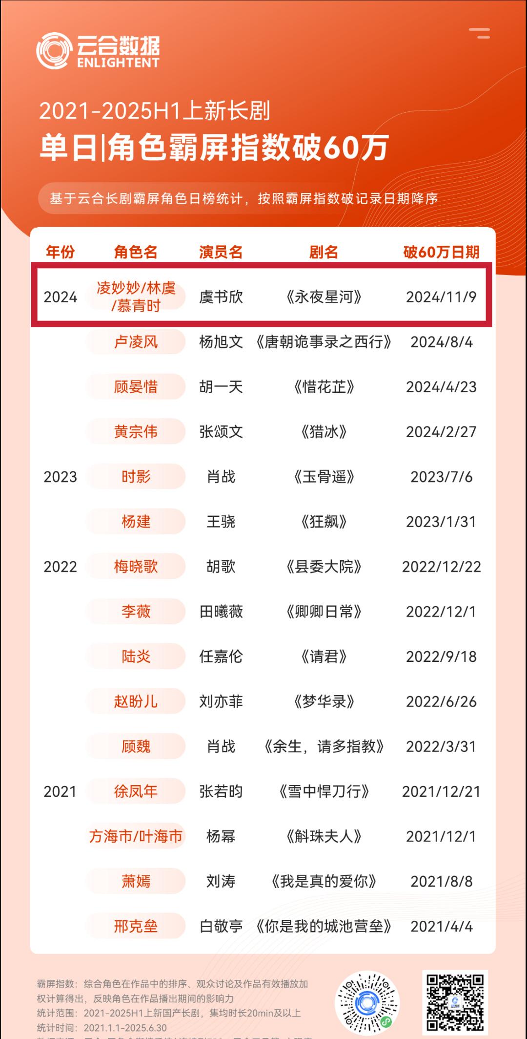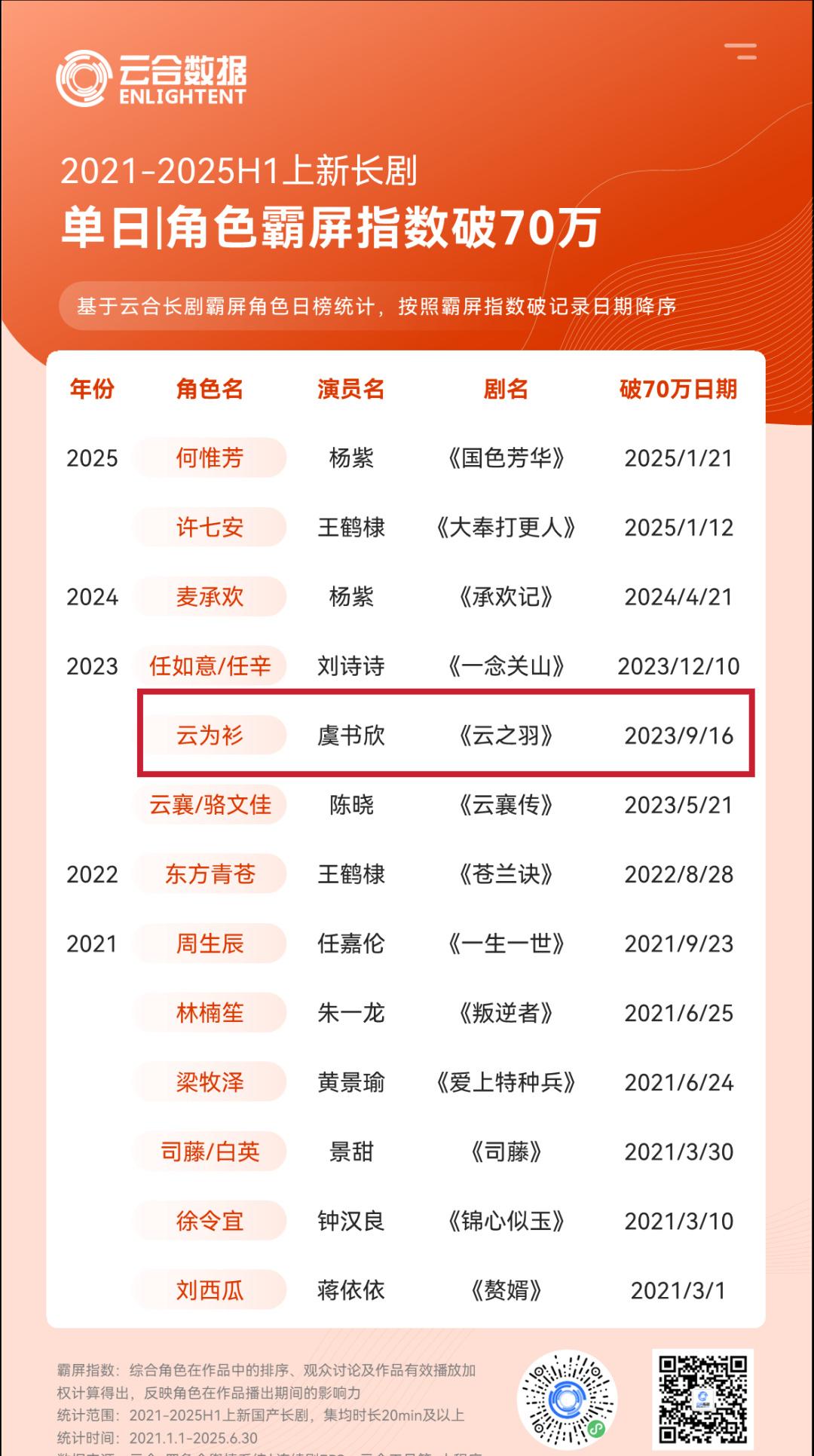 在2021年至2025年期间,虞书欣所饰演的角色单日霸榜指数统计中,日破90万的成绩在95演员中无人能及。其中,大爆剧《苍兰诀》中的一番女主虞书欣所饰演的小兰花角色,日破70万的成绩更是让人惊叹。此外,在空降播出的新剧《云之羽》中,虞书欣所饰演的角色云为衫也取得了日破60万的优异成绩。