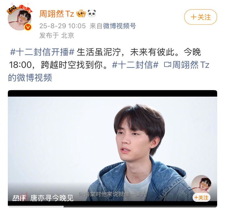[新闻]250830 周翊然加盟《十二封信》追剧团,引发粉丝热烈期待