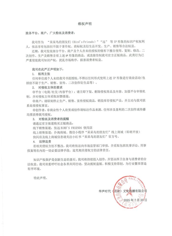 尊敬的粉丝们:大家好!最近,关于IP形象侵权行为的争议愈演愈烈。作为一个积极向上的粉丝团体,我们对IP形象保护尤为关注。近日,官方发出严正声明,关于未经授权商业使用“呆呆鸟的朋友们