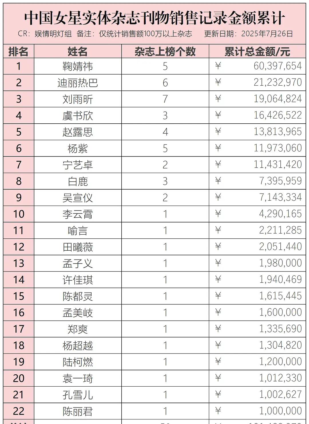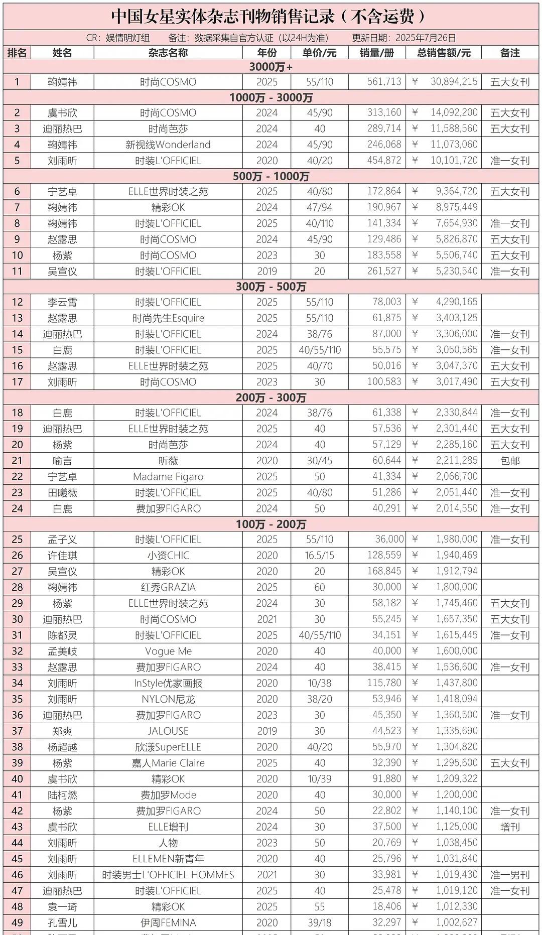 今日,我们有幸见证了自家偶像的辉煌时刻。在杂志榜单中,我们的star名字破百万的销量仅仅有22位女艺人达成,总共发售了50刊。其中,一本杂志的累计金额已经来到第12名的位置,高达200w的销量无疑是一个令人瞩目的分水岭。