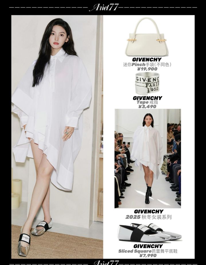 亲爱的粉丝们,今天我们要聚焦于一位我们深爱的明星——章若楠。她以一身令人惊艳的优雅造型亮相,展现了她独特的时尚魅力。章若楠身着一袭GIVECHY 2025秋冬系列的白色蝴蝶结衬衫裙