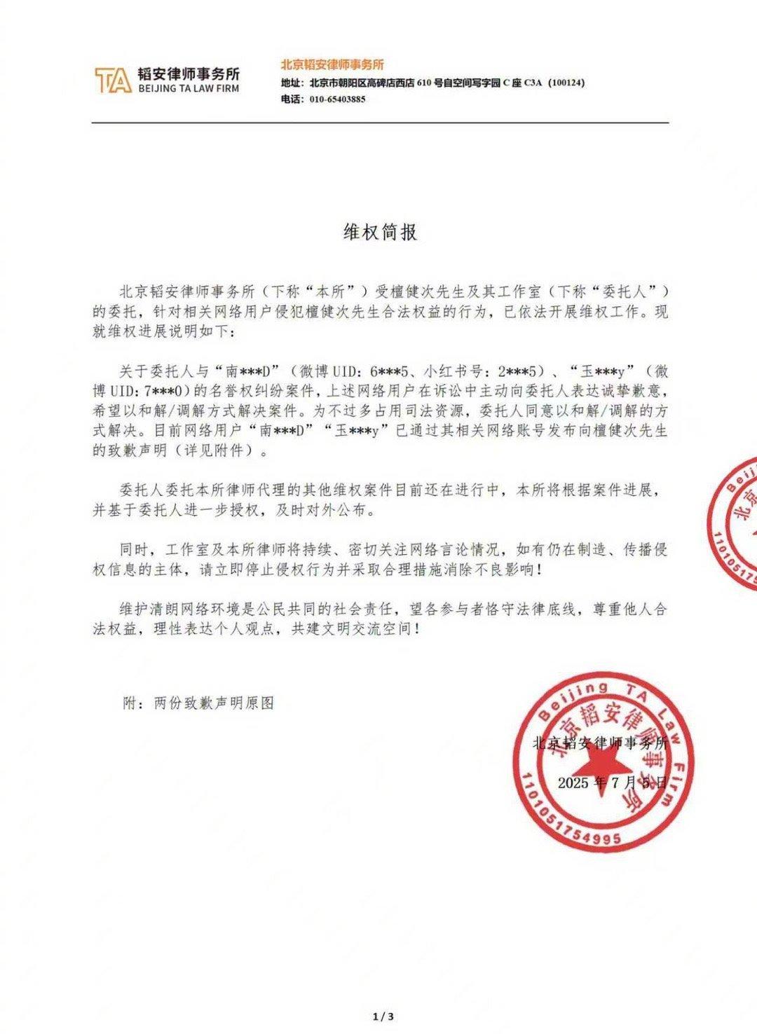 除了此次纠纷的解决,檀健次方委托的律所律师还代理其他维权案件,目前这些案件仍在进程中。檀健次委托律师表示,将根据案件进展及时公布相关信息,让粉丝了解案件的最新动态。