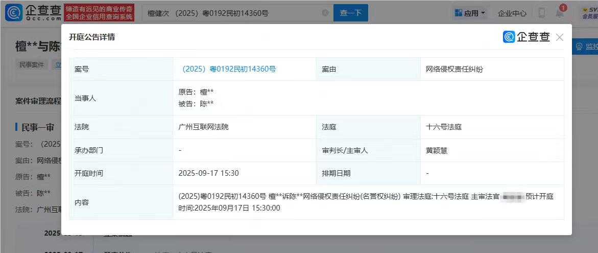 近日,备受关注的檀健次起诉维权案件迎来了新的进展。企查查APP显示,檀健次与陈某某的网络侵权责任纠纷案计划在广州互联网法院开庭审理。这一消息传出后,广大粉丝积极关注,并在不同平台上表达了对檀健次维权的坚定支持。