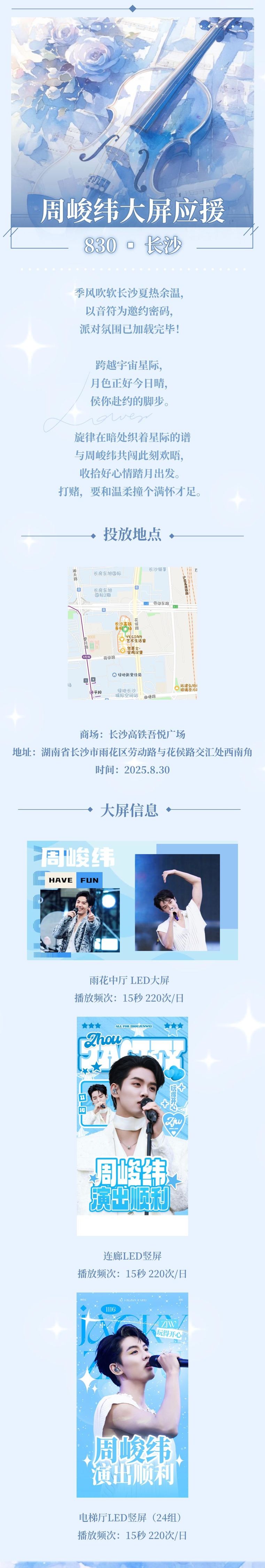活动地点位于湖南省长沙市雨花区劳动路与花侯路交汇处的西南角,一个繁华且富有活力的地点。届时,长沙雨花中厅的LED大屏、连廊LED竖屏以及电梯厅LED竖屏(共24组)将全天候播放周峻纬的精彩瞬间和最新动态。播放频次高达每日220次,每次播放时长15秒。这一盛大的宣传活动将展现周峻纬的魅力与才华,让更多的人了解并喜爱他。