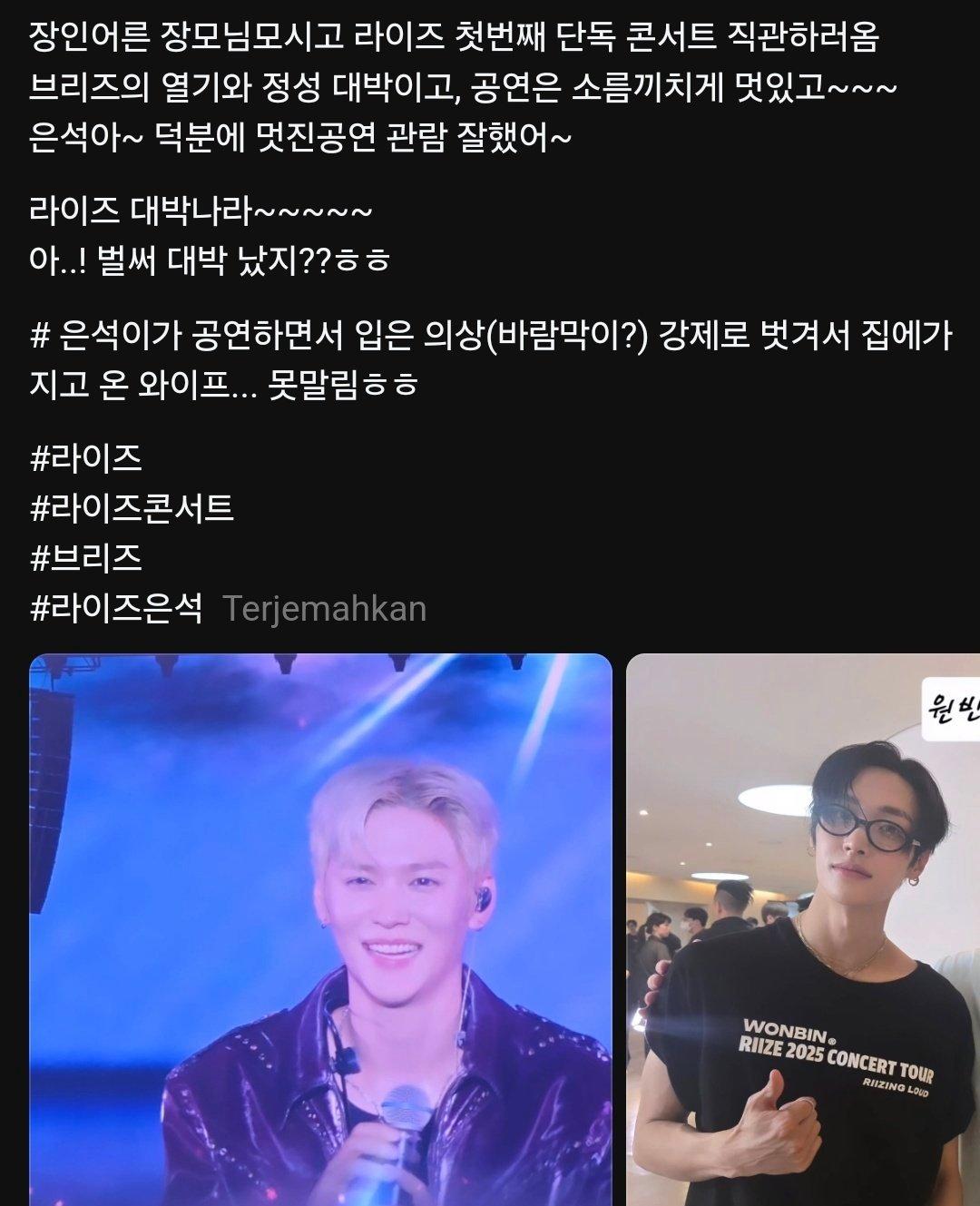 演唱会开始前,粉丝们就已经迫不及待地等待着了。其中,雨花石남편(恩搜姑父)分享了他的观后感。他带着岳父岳母大人一同前来,对RIIZE的演出充满了期待。他感慨道:“RIIZE的热情与诚意太棒了,演出震撼又帅气!”可以看出,RIIZE的音乐不仅仅吸引了年轻一代,就连年长一些的观众也为之疯狂。