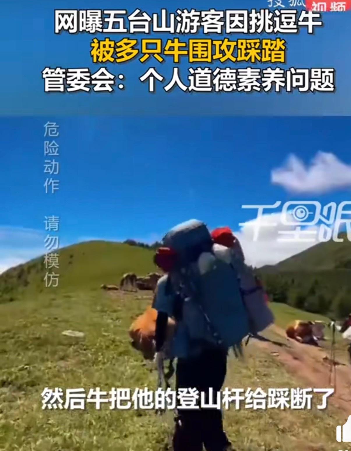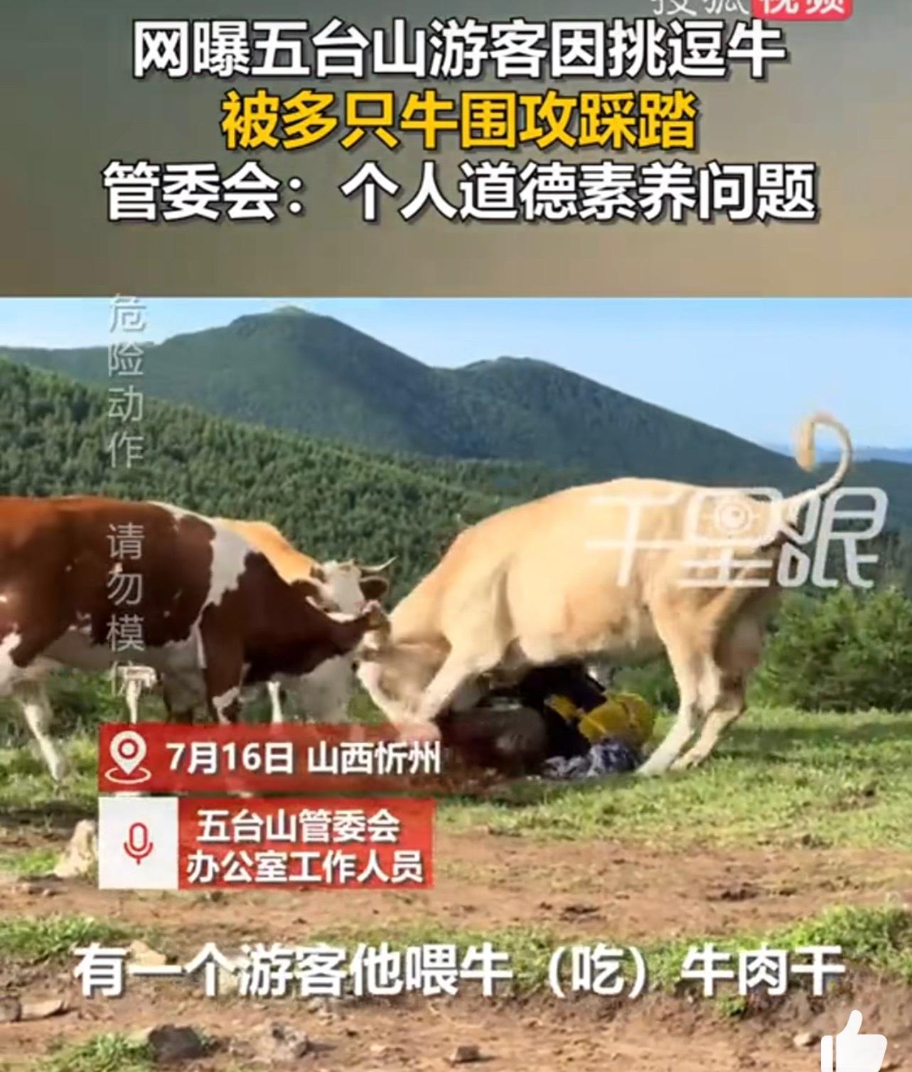 据了解,事件起因是部分游客给牛喂牛肉干,并用登山杆敲牛屁股,这一行为激怒了牛群,导致游客受到围攻踩踏。这一事件不仅给当事游客带来了危险,也损害了五台山这一著名旅游目的地的形象。