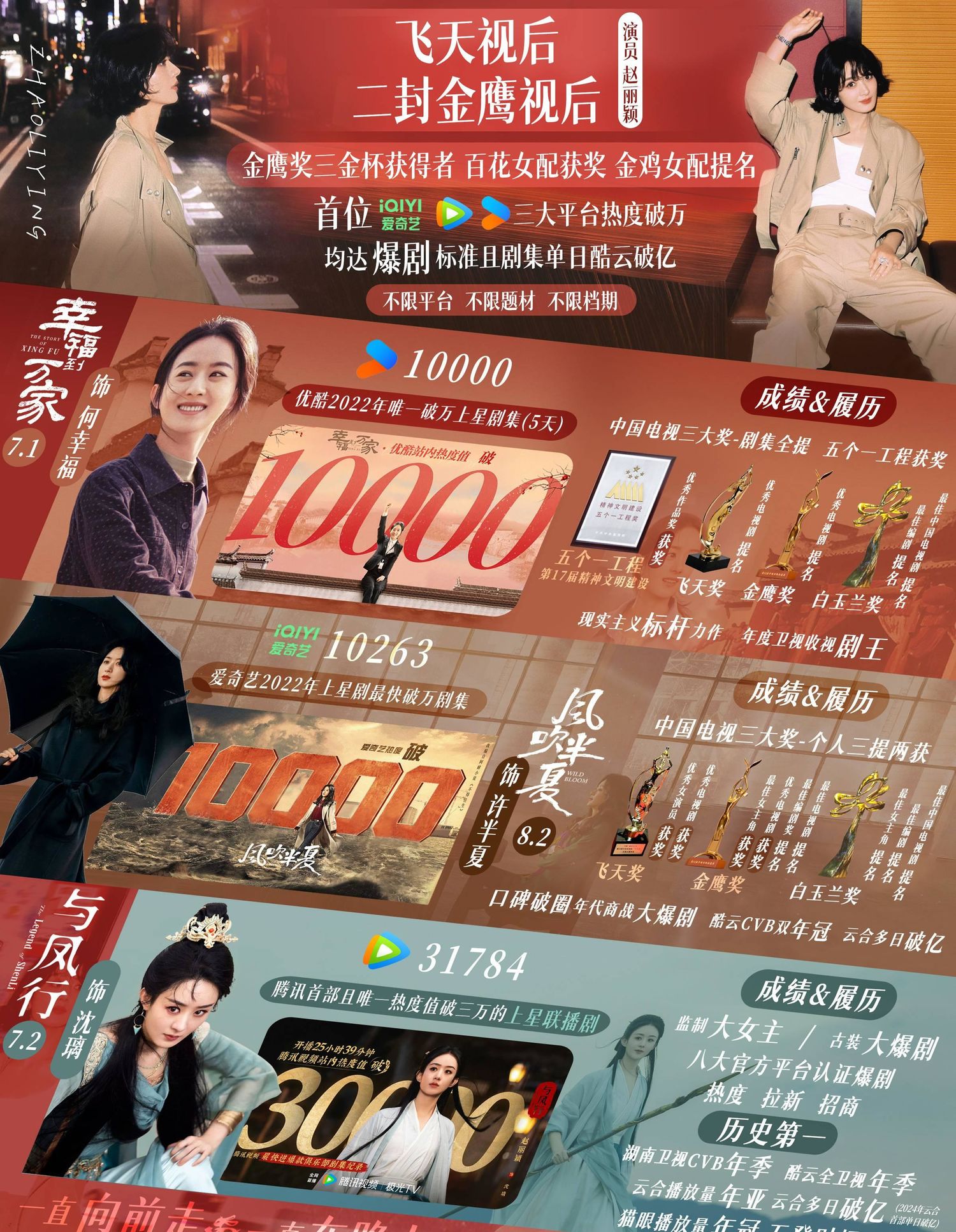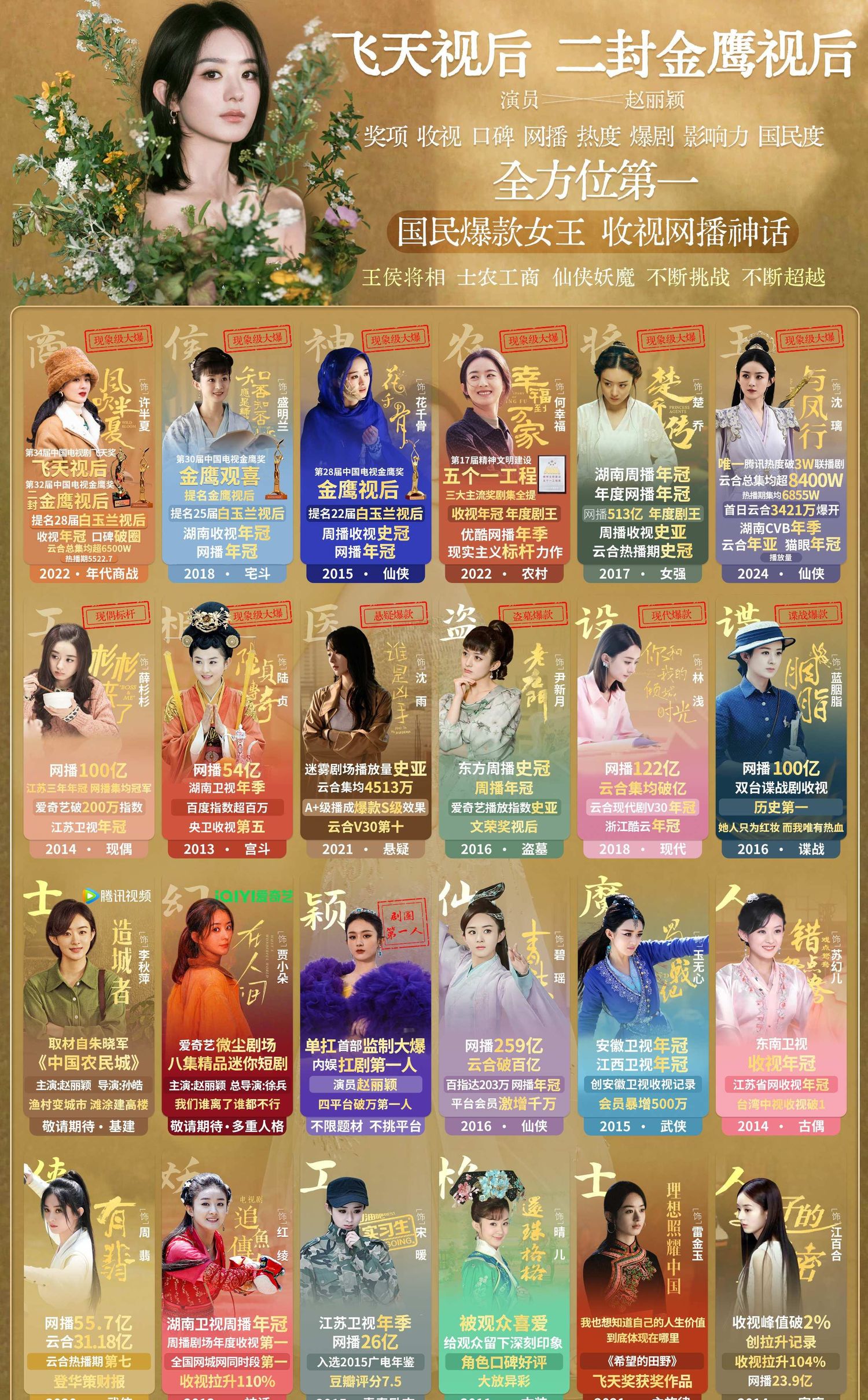 赵丽颖,这位备受观众喜爱的演员,以其出色的演技和卓越的成就,成为了内娱的璀璨明珠。她不仅是首位三平台破万演员,还是内娱收视年冠最多的演员,网播量不分男女top1,真正的收视女王。