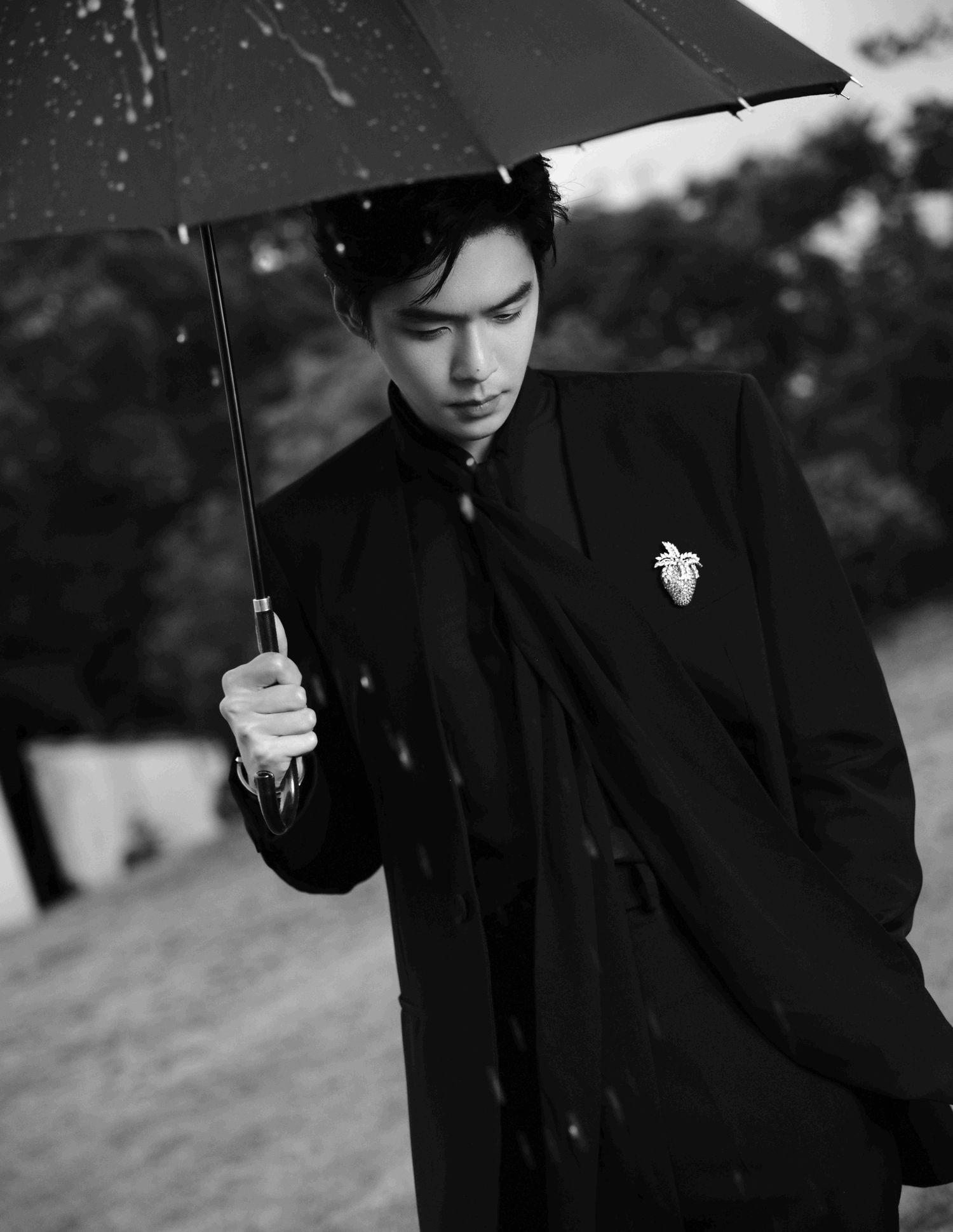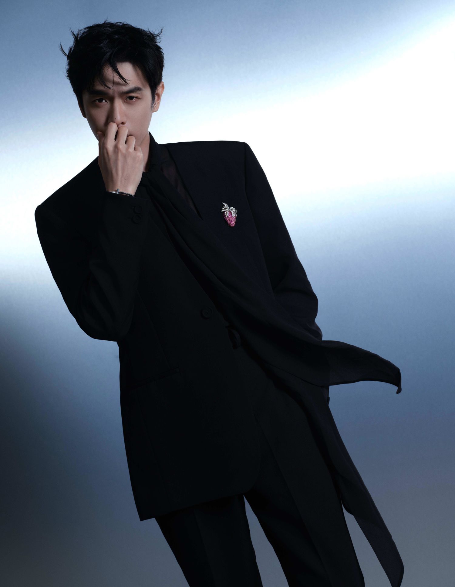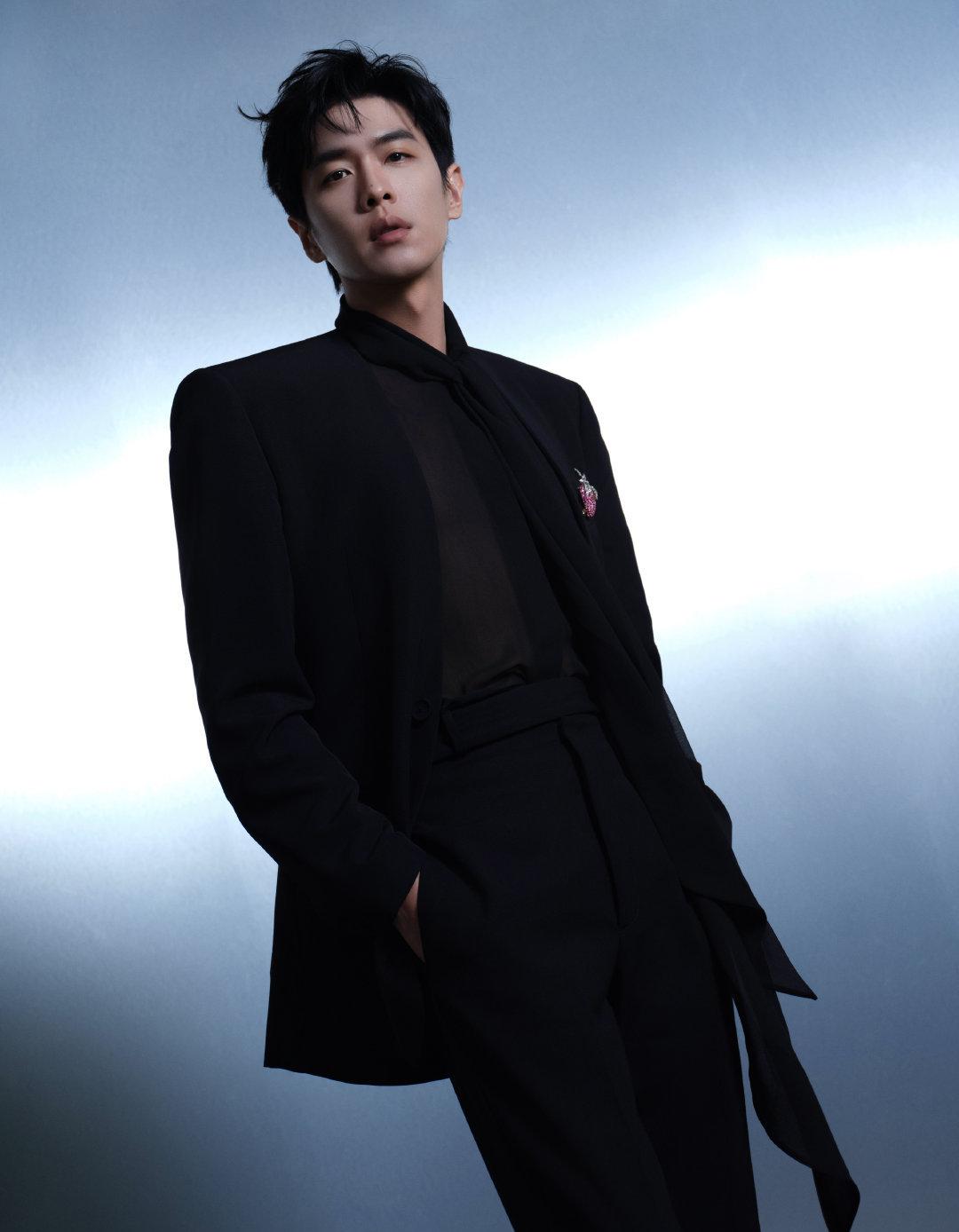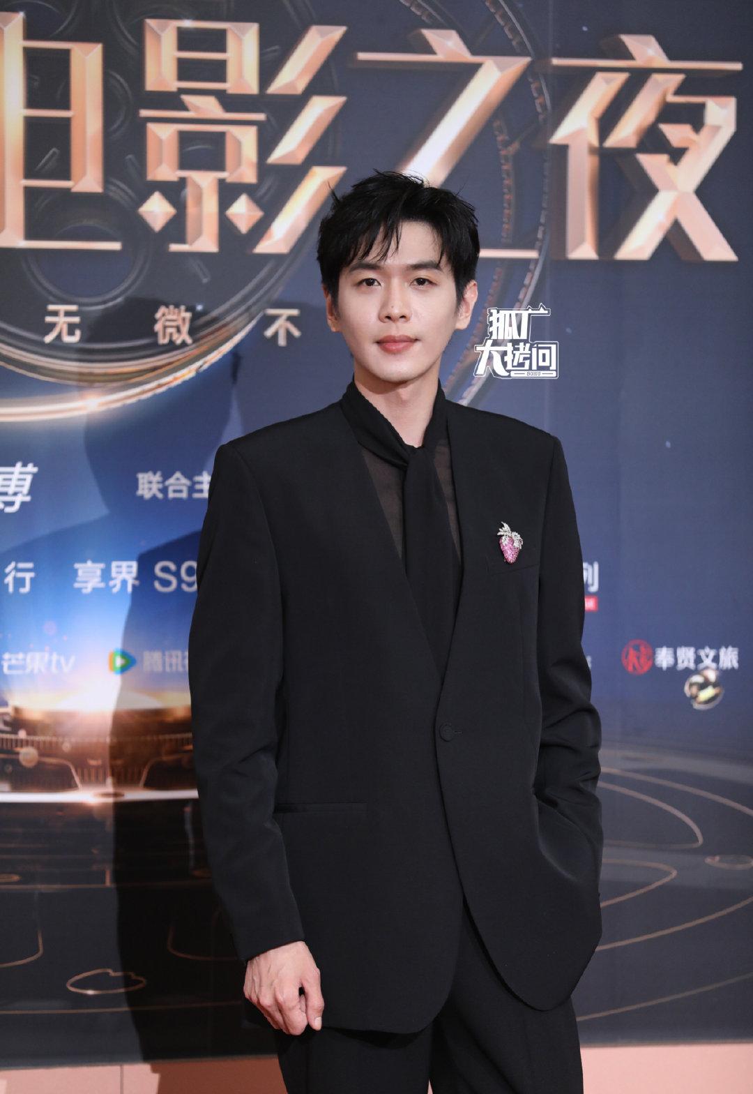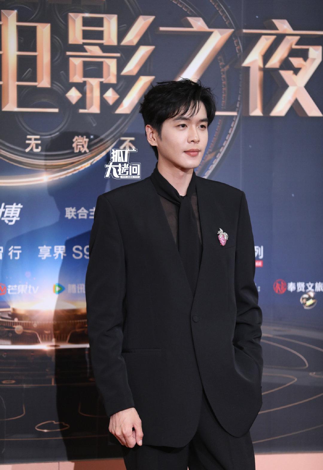 张若昀身着纯黑西服,搭配草莓胸针,给人一种既性感又利落的感觉。透视内搭更是点睛之笔,为整个造型增添了一抹神秘感。他在红毯上的表现自信而从容,展现了自己的专业素养和独特气质。