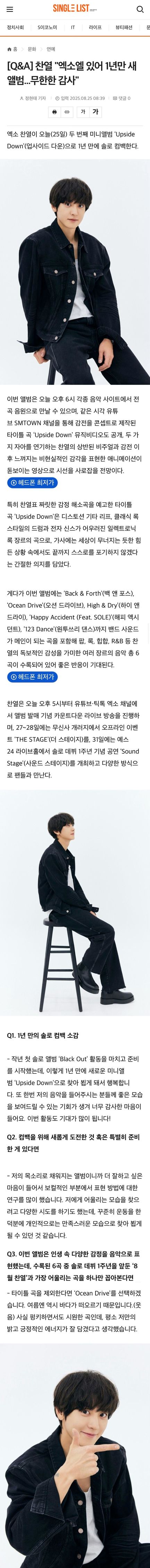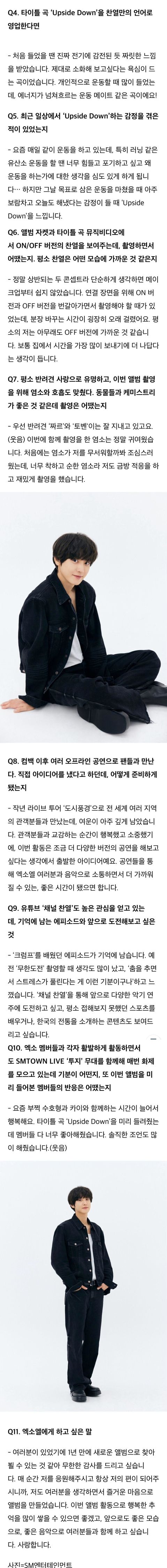 灿烈对于这次回归,感到十分幸福并充满感激。他表示,这次的新专辑是时隔一年后的精心准备,是为了向听他音乐的粉丝展现更好的面貌。在专辑的制作过程中,灿烈付出了很多心血,对每首歌曲都进行了深入的研究和尝试。特别是在主打歌《Upside Down》中,他用自己的声音填满了整张专辑,让人感受到他的音乐才华和独特的魅力。