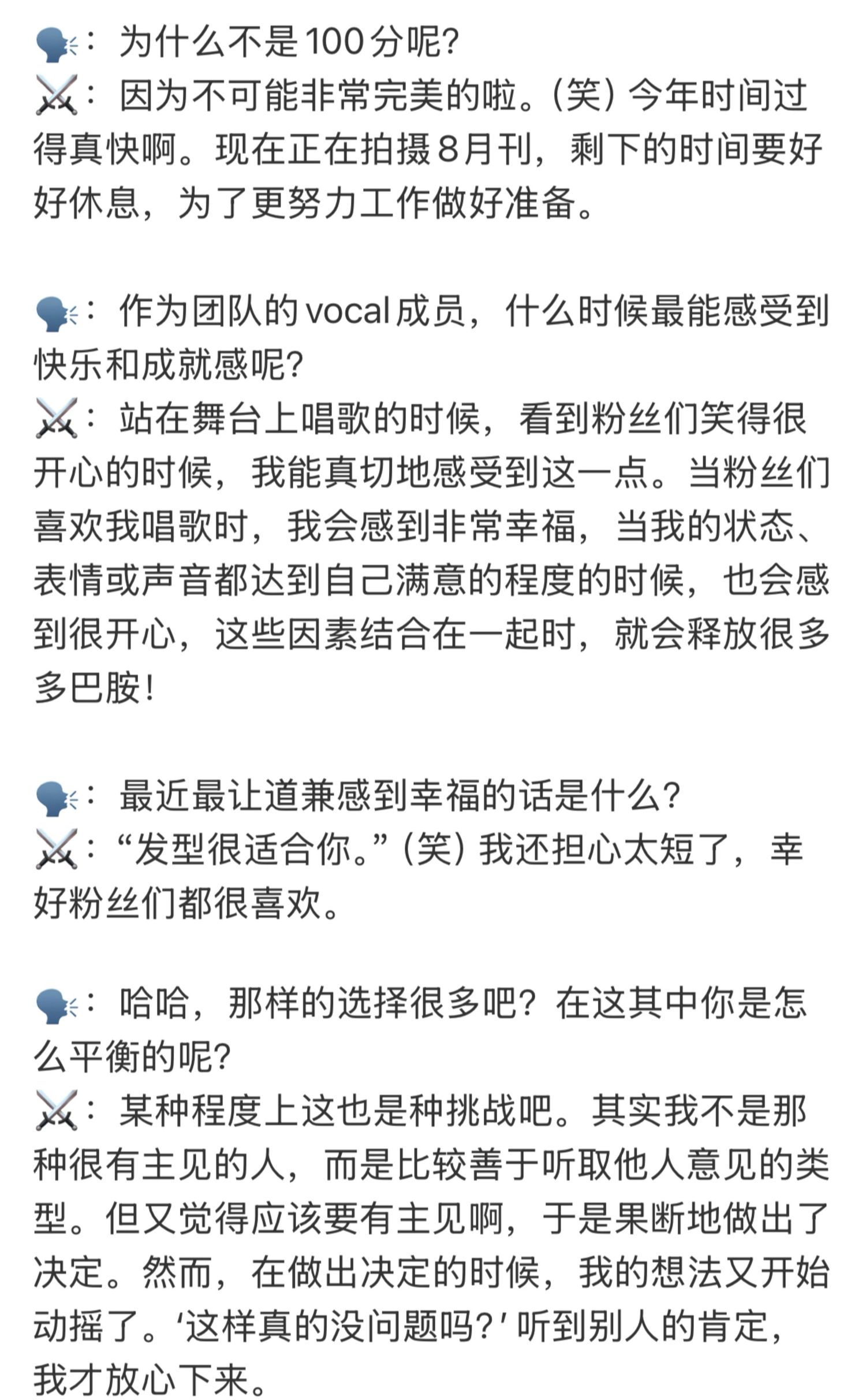 此外,李硕珉还表示,作为团队的vocal成员,当他站在舞台上唱歌的时候,看到粉丝们笑得很开心的时候,他能真切地感受到快乐和成就感。这也让他更加坚定了自己的音乐梦想。