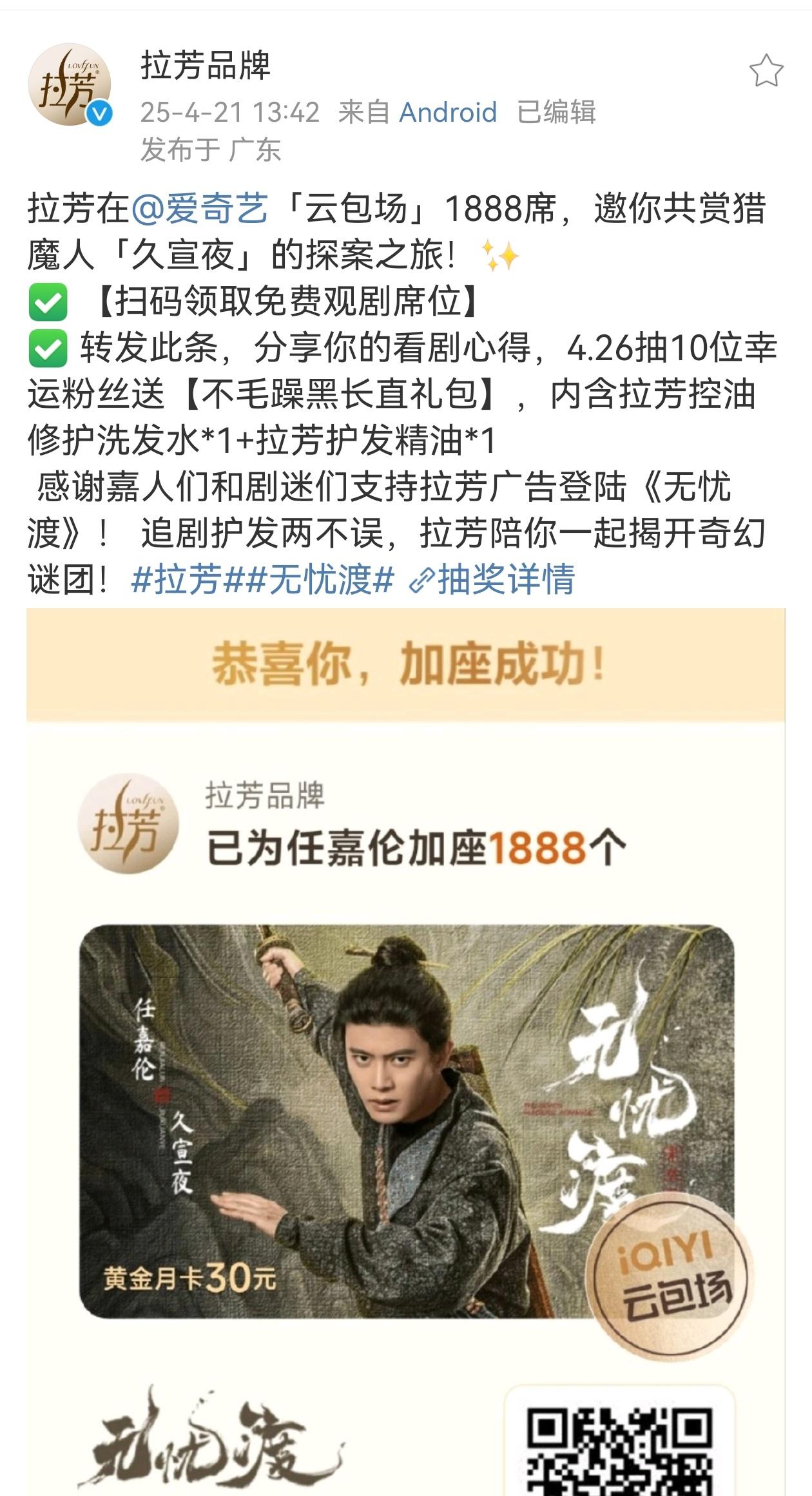亲爱的粉丝们,激动人心的消息来了!我们的偶像任嘉伦有了新的代言品牌——拉芳,一系列宣传活动也将于5月20日至22日拉开帷幕。让我们一起期待并欢呼吧!