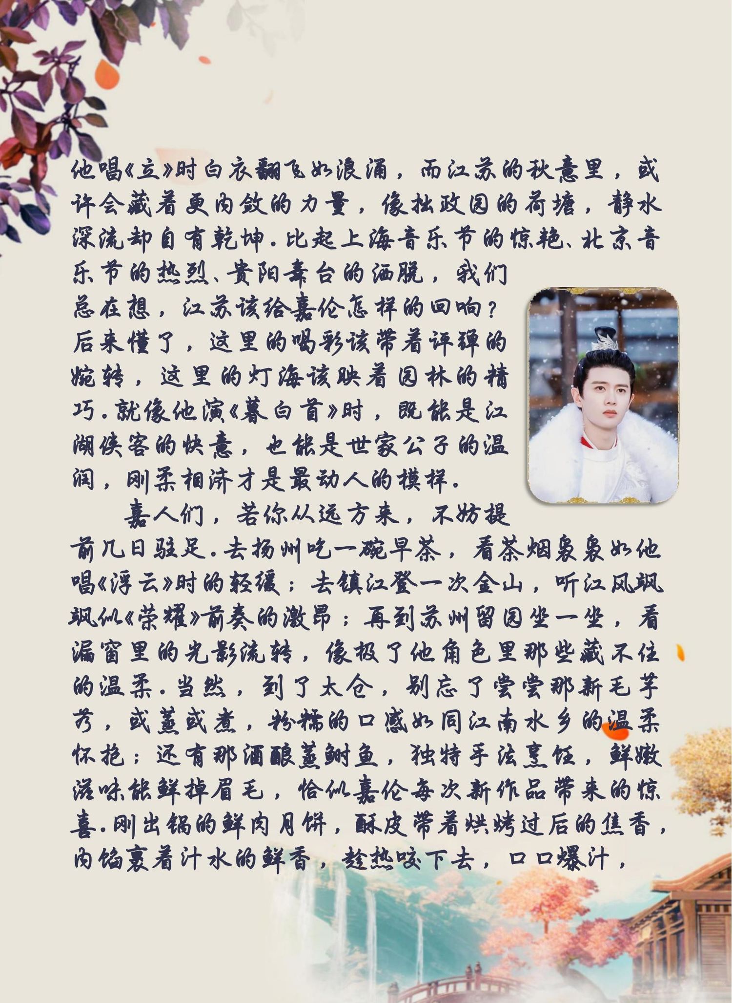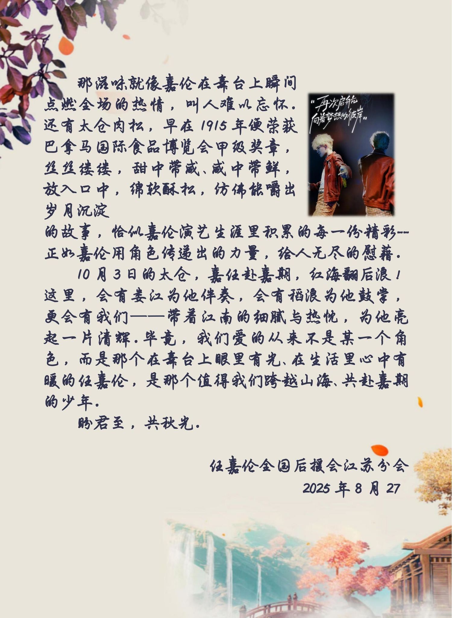 总之,江苏太仓元气森林音乐节,任嘉伦与粉丝的秋日之约,是一场不容错过的盛事。让我们共同期待这一天的到来,为任嘉伦加油打气,感受江南水乡的魅力和音乐的力量!