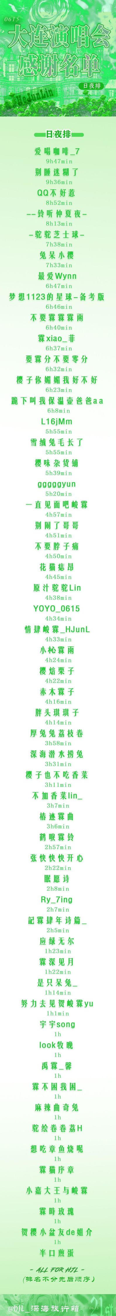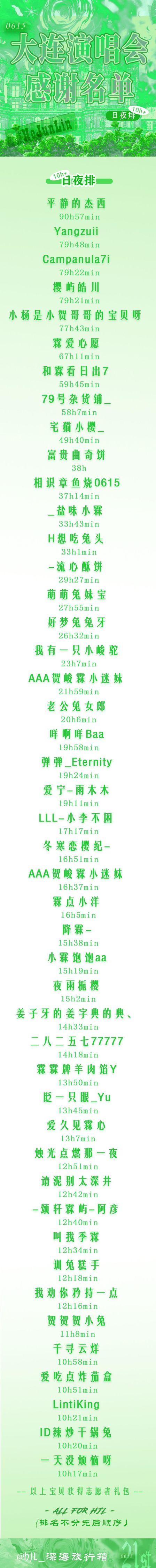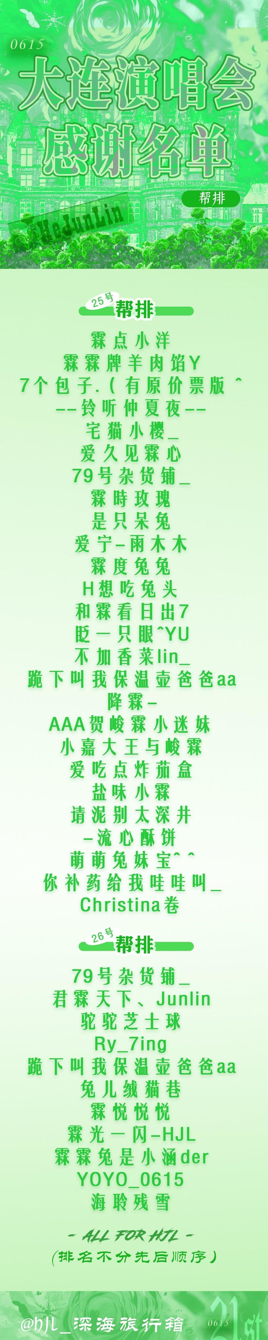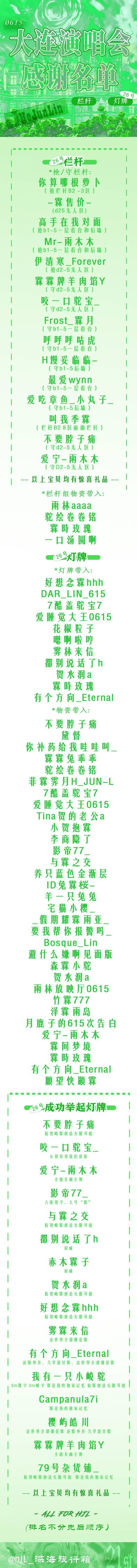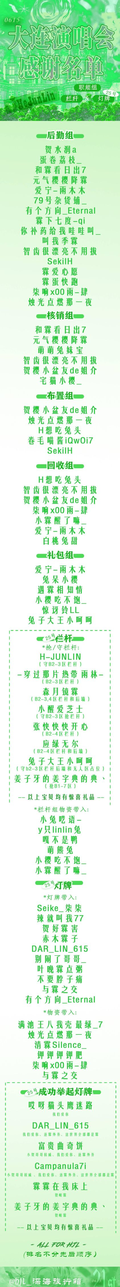 感谢名单已经发布,每一名字背后都代表着一位为贺峻霖演唱会付出辛勤努力的粉丝。是你们的不懈努力,让场馆里只属于贺峻霖的长灯牌亮起,点亮了这场璀璨的演唱会。我们要特别感谢“深海”旅行箱的志愿者们,是你们的工作让线下活动顺利进行,你们是这场演唱会的重要一环。