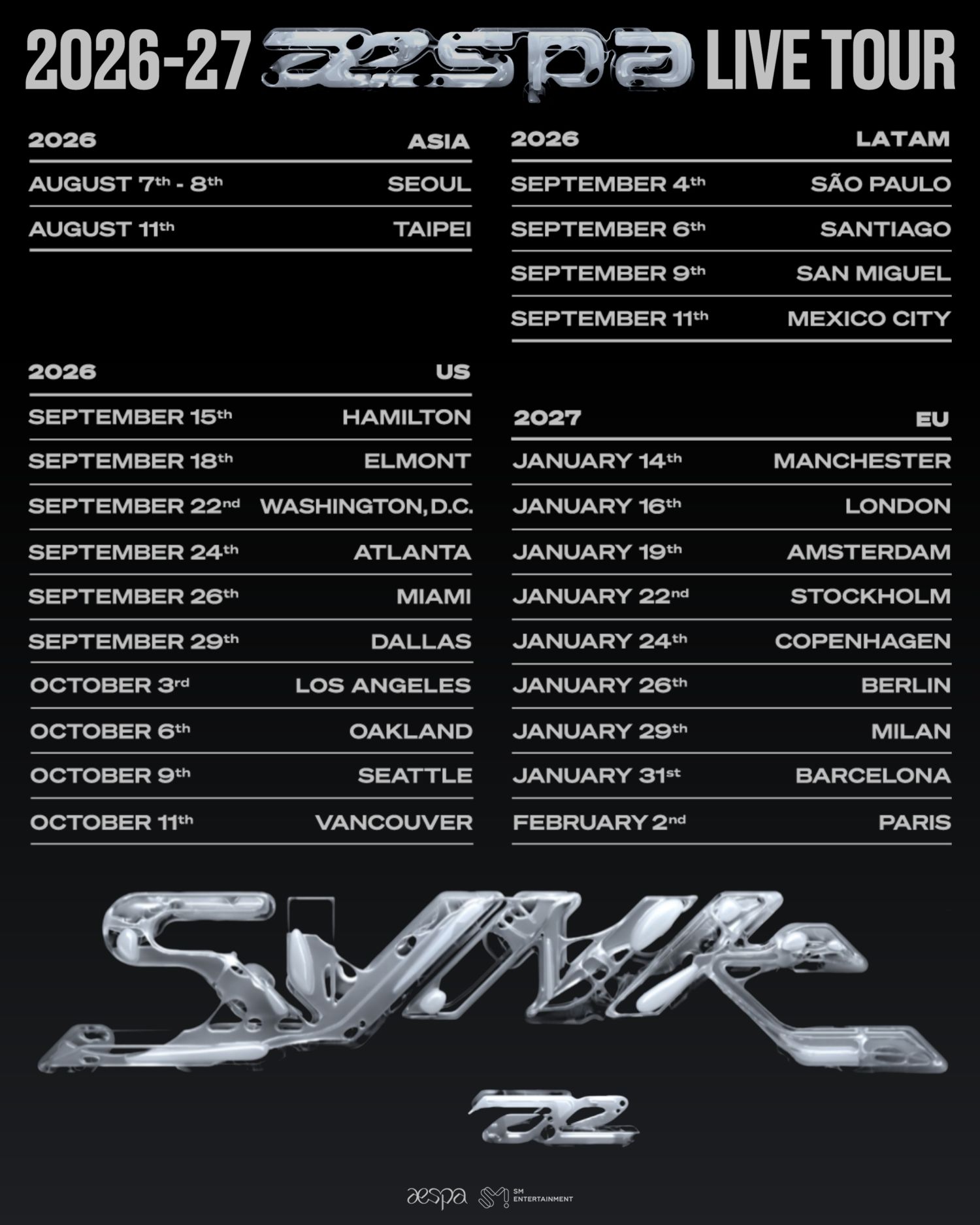 根据同步公开的日程表,aespa将于8月7~8日在韩国首尔拉开序幕,随后于8月11日前往中国台湾台北开唱;9~10月将巡演巴西圣保罗、智利圣地亚哥、墨西哥圣米格尔德阿连德、墨西哥城,以及加拿大汉密尔顿、美国艾尔蒙特、华盛顿D.C.、亚特兰大、迈阿密、达拉斯、洛杉矶、奥克兰、西雅图、温哥华等南北美洲主要城市。