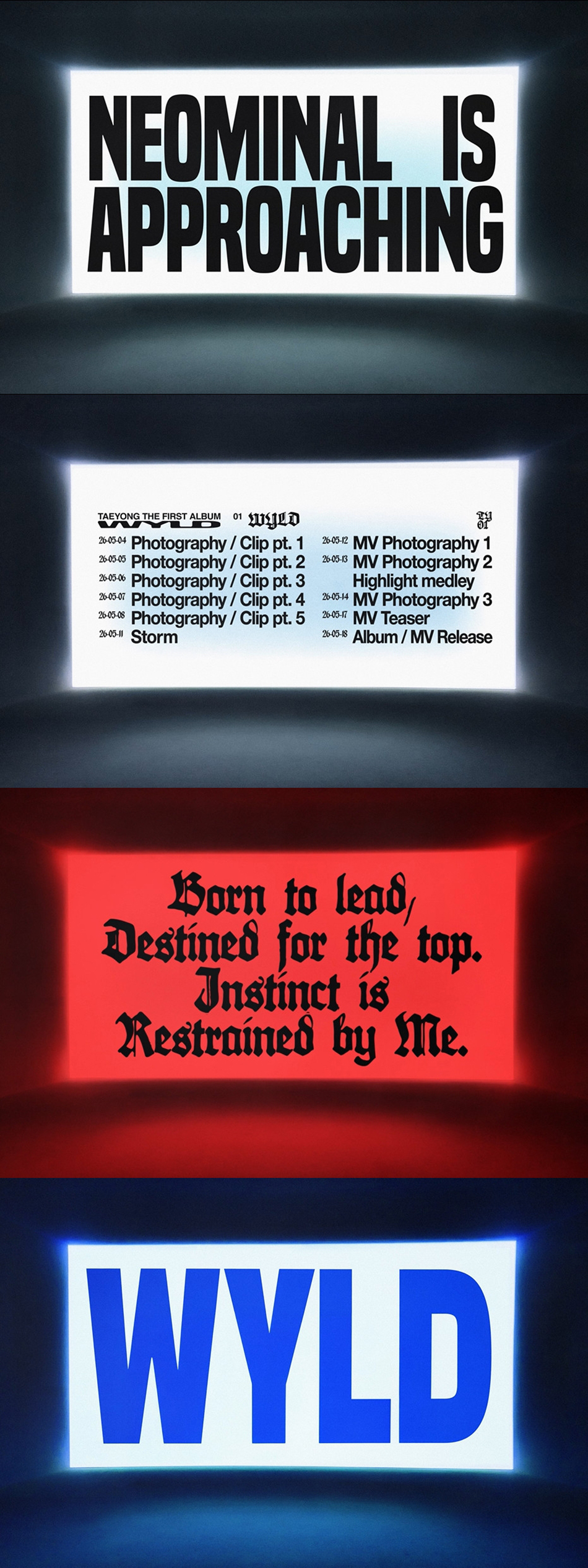 泰容将于5月4日至8日通过预告图及Mood Sampler视频,展现以全新概念变身的面貌,并通过13日的歌曲高光串烧视频、17日主打曲《WYLD》MV预告等一系列内容接力,进一步提升大众对首张正规专辑的期待感。